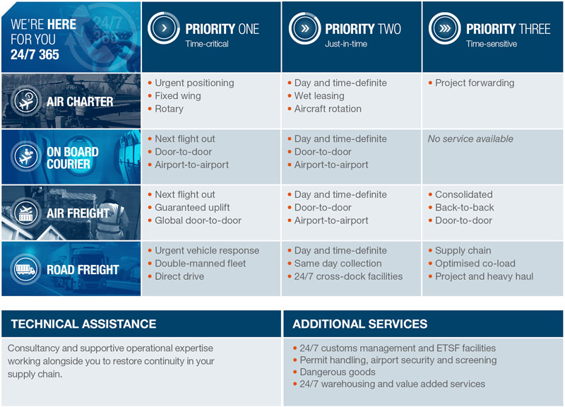 Here at Priority Freight, our time critical logistics specialists understand the need for urgent, well-organised and logical shipping services. That’s why we manage all aspects of cargo shipping for all modes of transport. From air freight and air charter to on board courier services and point-to-point road haulage, we provide fast, efficient freight forwarding designed to meet your most critical deadlines.